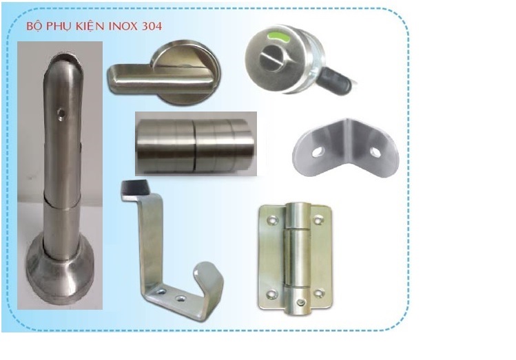 - Phần inox: Chân vách, tay nắm, khóa, bản lề, ke góc, móc treo áo.